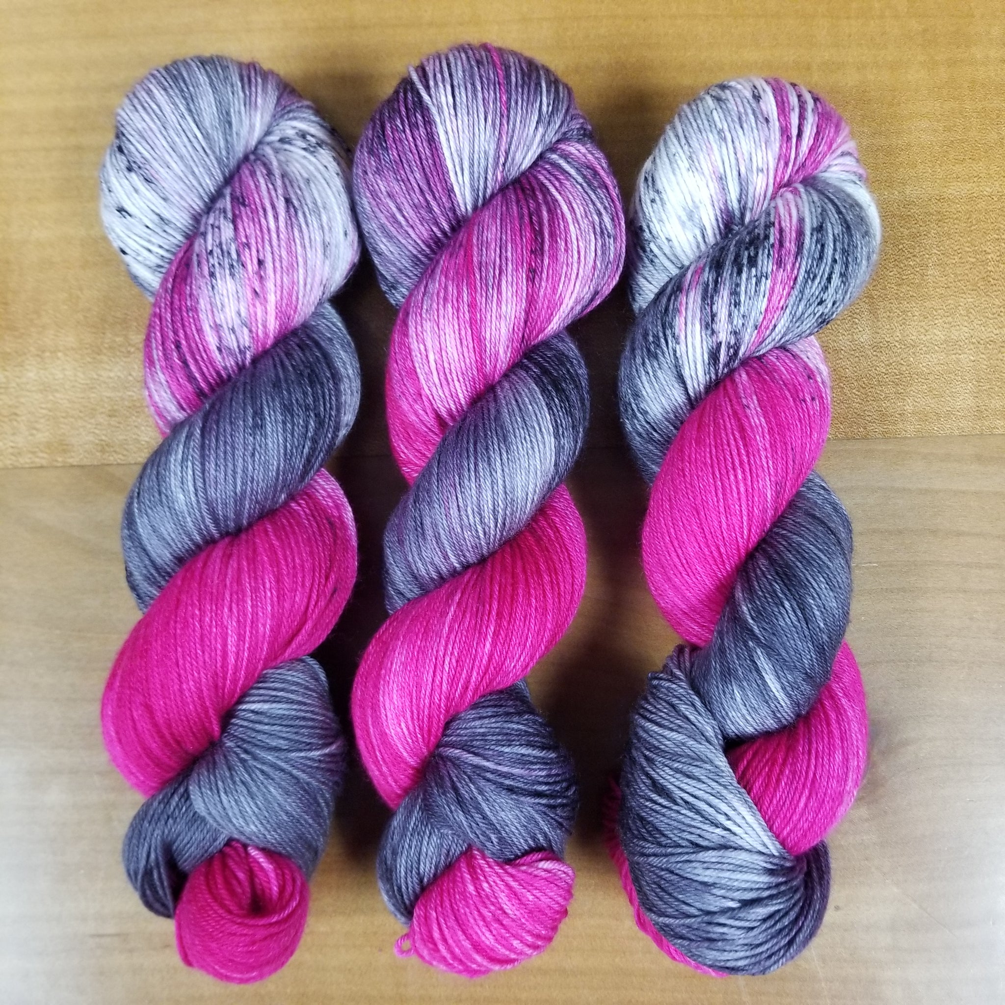 Our "Full Pink Moon" anniversary color features hot pink and shades of grey on a white base, and is speckled with grey and black. Each skein is one of a kind.